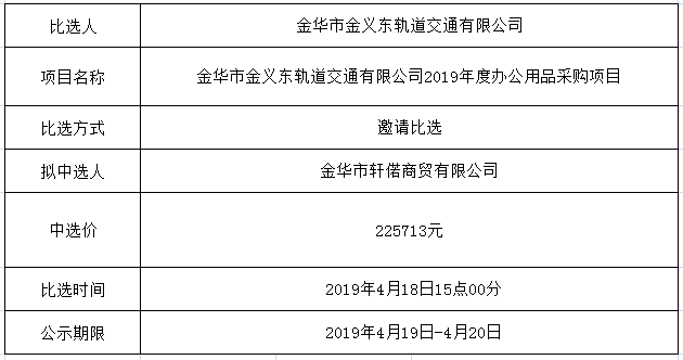 中選公示(金華市金義東軌道交通有限公司2019年度辦公用品采購項目)
