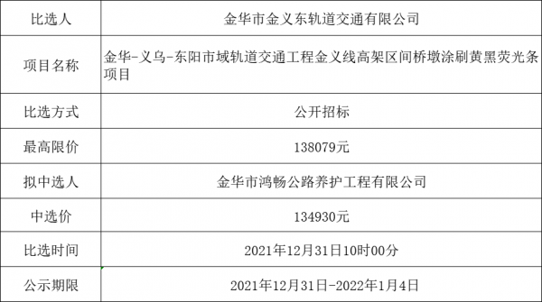 金華-義烏-東陽市域軌道交通工程金義線高架區(qū)間橋墩涂刷黃黑熒光條項(xiàng)目中標(biāo)公示
