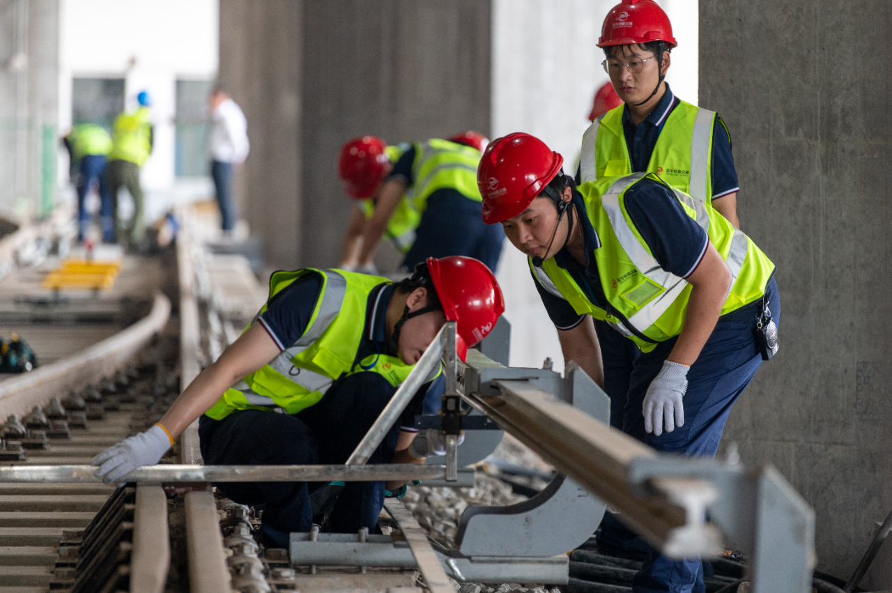6月11日,在浙江省金華市金義東市域軌道交通工程塘雅車(chē)輛段,青年職工選手在參加軌道交通更換鋼軌接頭夾板項(xiàng)目技能比武。